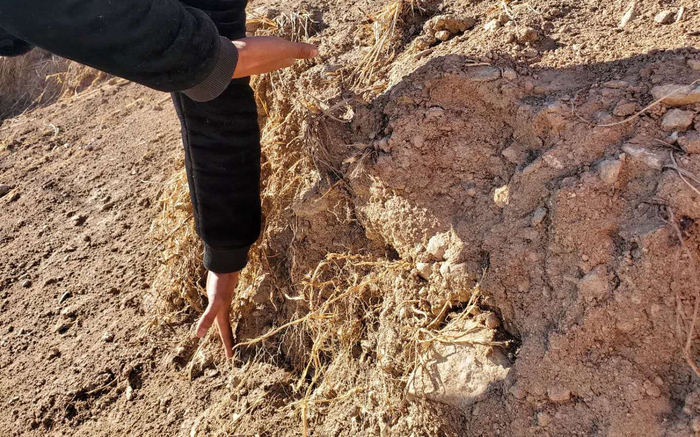 2019年12月10日,马金文(化名)在警方挖掘完毕的土坑旁弯下腰去用手臂比了比,土坑只有大半截手臂的深度。新京报记者 李云蝶 摄