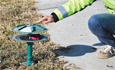 在一个拦鸟网下端,记者看到一个类似手动滑轮的装置,这个小小的装置是鸟击防范管理模块的工程师们自主研发的成果。“以前换撑杆、换网子特别麻烦,效率很低,换网难度大。”郭彬说,安装这个装置后,工作人员可以像升降国旗摇动手柄便可将网子升上去或者降下来,非常方便。