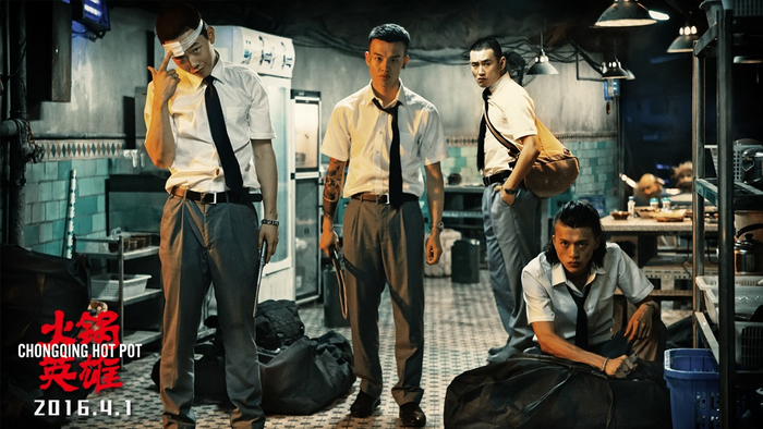 电影《火锅英雄》中,张亦驰、尹昉、王彦霖、李九霄(左起)饰演劫匪。