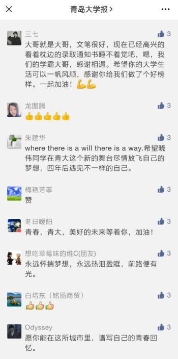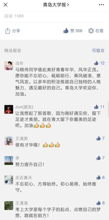 怀着对大学生活充满向往和憧憬,在还未入学的暑假期间,马晓伟参与了青岛大学新生征文比赛并拿了校一等奖,这不仅带给了马晓伟自信和喜悦,还让他在校园的不同地方留下自己的足迹。积极参与竞选,以全票担任班长,同时被推选为第一批入党积极分子;加入学生会,积极投入到各项学生工作中;喜欢写作,采访,大一时加入记者团;寻找自己感兴趣的竞赛并提前开始准备;不放松懈怠,在期末考试中取得佳绩。也正是一路上取得的一个又一个的成绩也让他更加坚定了以后的道路——保研。