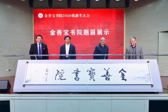 盖钧镒院士、万建民院士、钟甫宁教授、董维春教授共同展示了由郑福生老先生题写的金善宝书院牌匾。