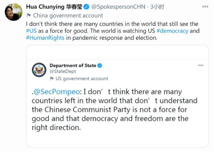 对此,2日下午,华春莹在推特上贴出美国国务院上述第一条推文截图,用蓬佩奥的句式回击道,“我不认为世界上还有很多国家仍然把美国看作是一股向善的力量。全世界都在关注美国在应对大流行病和选举中的民主和人权。”↓