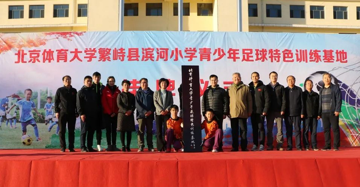 在兴致勃勃地观看了滨河小学足球队的训练后,双方嘉宾共同为“北京体育大学繁峙县滨河小学青少年足球特色训练基地”挂牌揭幕,并进行亲切座谈。