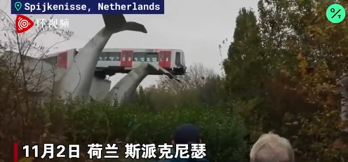 在荷兰鹿特丹附近的斯派克尼瑟市,一辆轻轨列车2日突然冲出轨道,万幸的是冲出轨道的列车段架在了轨道高架桥附近的鲸鱼尾巴雕塑上。