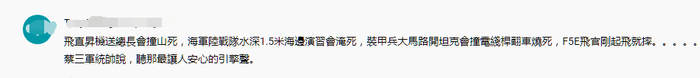 “飞直升机送总长会撞山死,海军陆战队水深1.5米海边演习会淹死,装甲兵大马路开坦克会撞电线杆翻车烧死,F-5E飞行员刚起飞就摔……蔡英文说,‘听那最让人安心的引擎声’。”