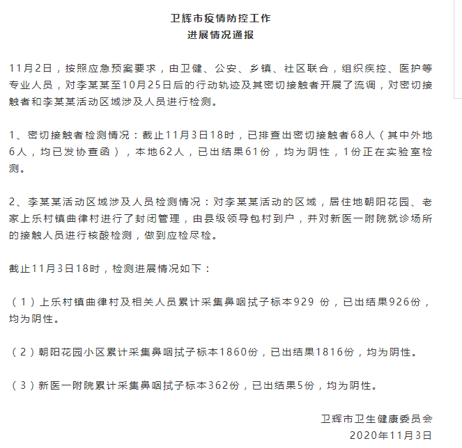 1、密切接触者检测情况:截止11月3日18时,已排查出密切接触者68人(其中外地6人,均已发协查函),本地62人,已出结果61份,均为阴性,1份正在实验室检测。