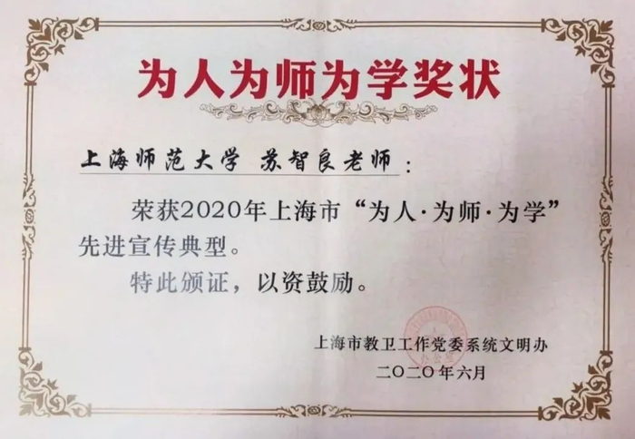 近日,我校人文学院苏智良教授荣获由上海市教卫工作党委开展的2020年度“为人•为师•为学”先进宣传典型。