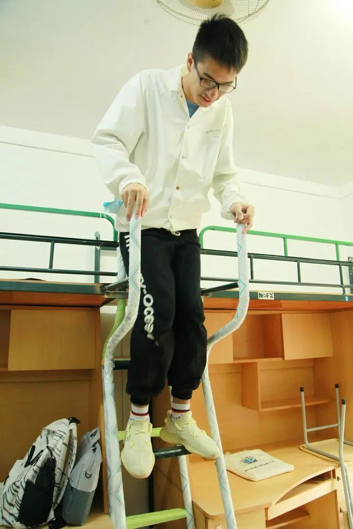 因为个子高,以前住校期间,因为床铺不够长,他经常缩着身子睡觉、把脚搁在床外面或者搁在别的床铺上。考上大学后,学校得知了他的情况,根据他本人意愿,提前给他的床板加长了30厘米,从而使床位增加了30公分的长度,让他有了能够安心睡觉的“加长版”床位。
