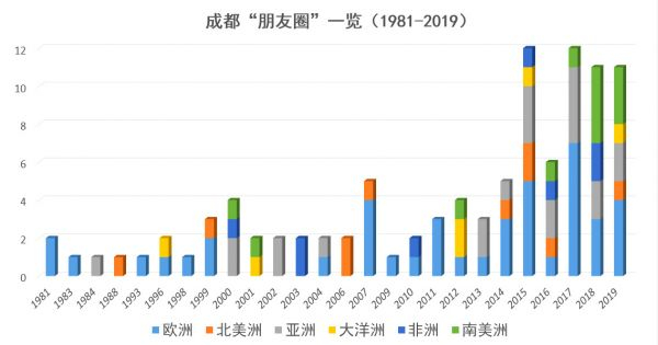 常言道:穷在闹市无人问,富在深山有远亲。深居内陆、群山环抱的成都虽然热情好客,但在相当长一段时间里友城(含友好合作关系城市)增速并不快。从上图可以看到,成都“朋友圈”的扩大过程,可大致划为1981至2000年、2001至2010年、2011至2019年这3个阶段,友城增速分别为0.8个/年、1.8个/年、7.4个/年。特别是2017至2019年这3年间,成都的友城数量呈高位增长态势,其中的快慢变化不言而喻。