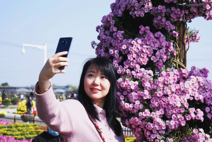 在这秋光明媚的日子里,人气鼎盛,游人们成群结队,迷失在花海中。