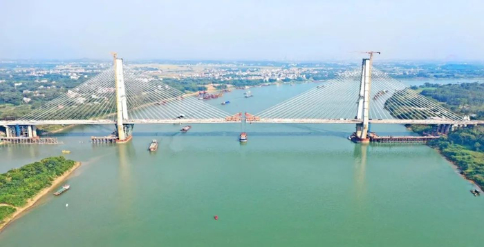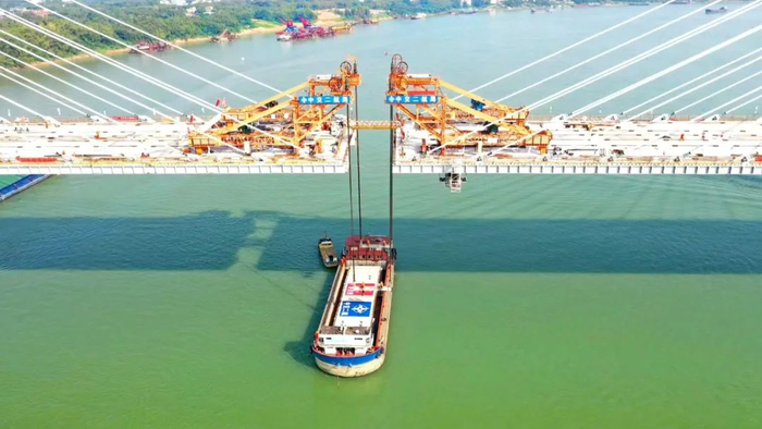 11月4日,广西在建最大跨径斜拉桥——荔浦至玉林高速公路相思洲大桥完成主桥合龙段主梁吊装,全力冲刺年底通车目标任务。