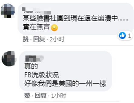 也有网友在脸书表示,“某些脸书社团到现在还在崩溃中……实在无言”;“FB的洗版状况,好像我们是美国的一州一样”。