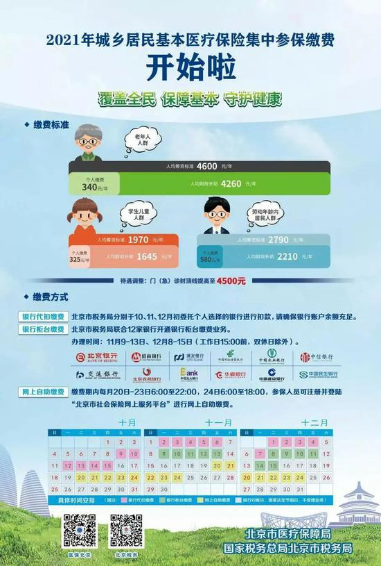 [北京市医保局、北京市税务局]温馨提示:2021年城乡居民医保已开始缴费,学生儿童325元,老年人340元,劳动年龄内居民580元,请您在12月24日之前缴费。