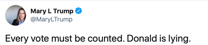值得注意的是,当地时间4日,玛丽·特朗普就曾发布推特攻击特朗普说:“每一票必须被计算在内,唐纳德在说谎。”