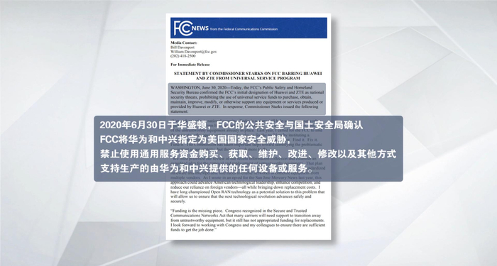 去年11月,FCC通过一项决定,将华为认定为所谓的“国家安全威胁”,禁止美国运营商用该委员会的基金购买华为和中兴的设备和服务。华为随即反击,向美国法院提交起诉书,请求推翻这一非法决定。但今年6月底,华为和中兴仍被美国联邦通信委员会列入“国家安全威胁”清单。