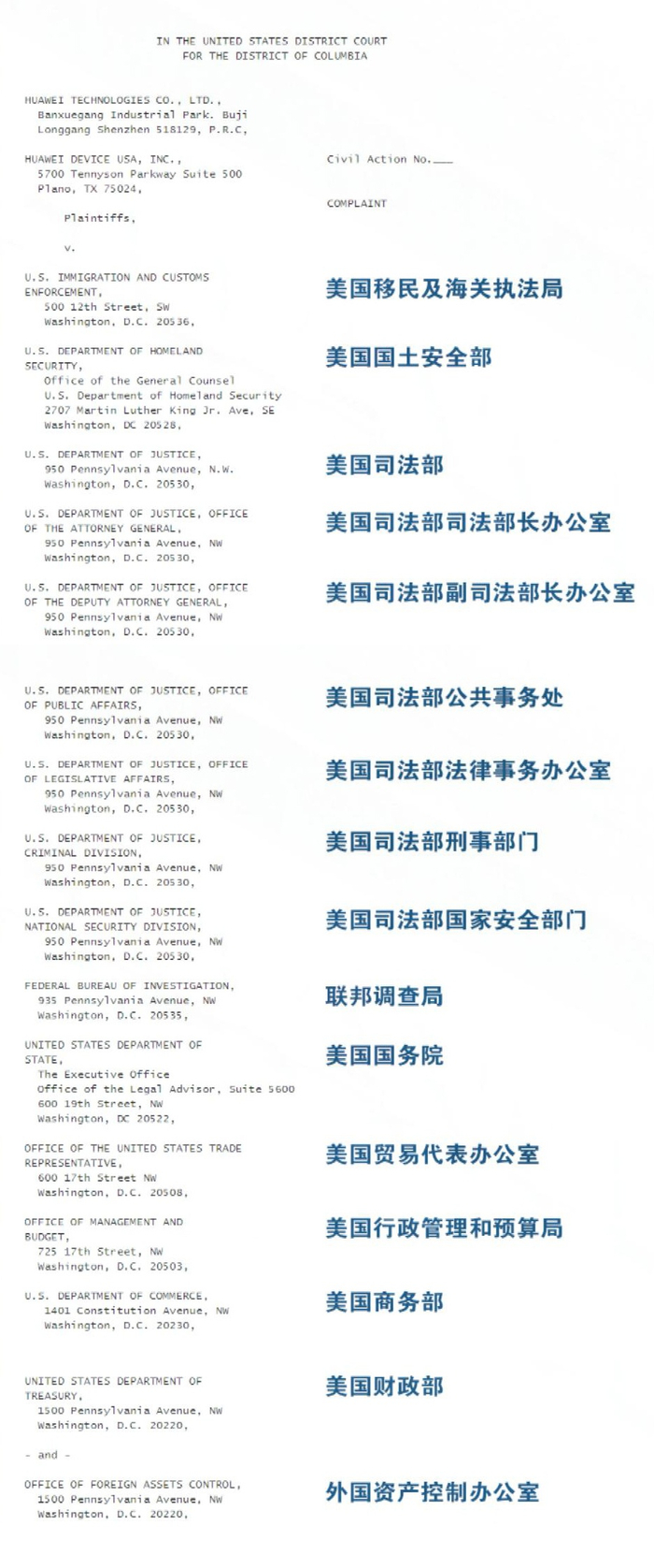 据加拿大广播公司消息,美国华盛顿特区联邦法院的一份起诉书显示,华为已在美国提出诉讼,控告包括美国联邦调查局、司法部、商务部、国务院、国土安全部在内的至少16家政府部门和机构,故意拖延公开多份涉及孟晚舟被捕案的文件。该消息也得到了华为内部人士的证实。