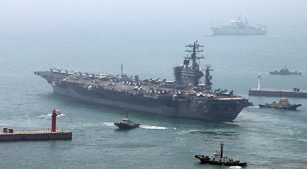 驶离韩国釜山港的美国“尼米兹”号核动力航母。