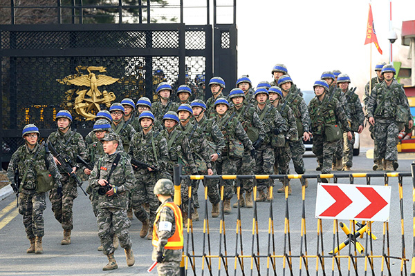 2016年3月7日,在韩国浦项,韩国海军士兵参加联合军事演习。