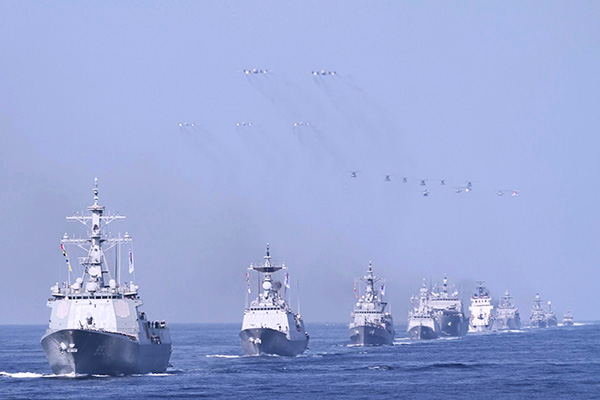 2015年10月23日,在韩国釜山附近海域,韩国海军舰队亮相观舰式。图|新华社