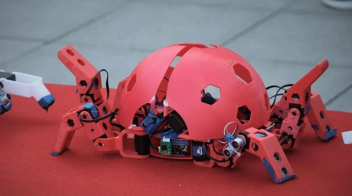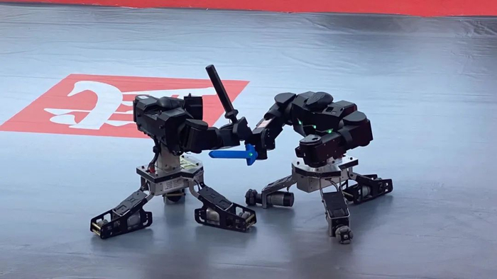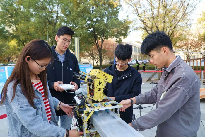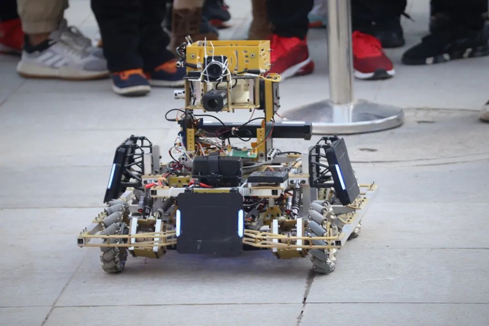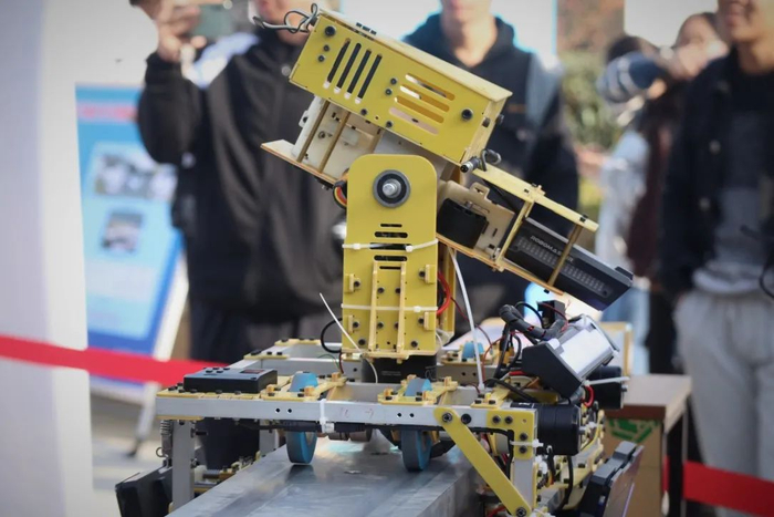 在优秀教师团队的带领和指导下,长安大学的学生科技创新活动同样有声有色、亮点不断。在活动现场,一个展示台上的几十台机器人吸引了众多参观者的目光。正中央的擂台上,两个黑色机器人正在激烈比试,这是由长安大学电子与控制工程学院学生研发的擂台比武机器人。