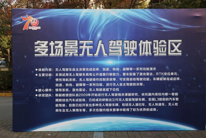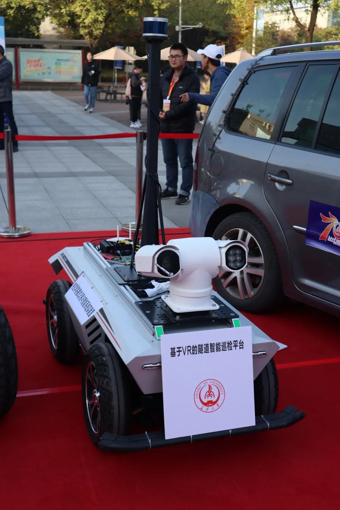 智能装备展区分为创新技术展区、专用检测车展区、车联网展区、学生成果展区、科技成果展板区、研究生创新成果展板区等,集中展示了学校师生研发的系列无人驾驶车、多功能道路综合检测车、科研平台车等智能技术研究成果,以及各类型机器人、赛车等学生创新成果。