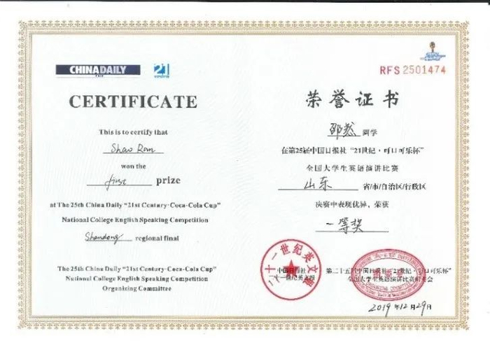 参加2019年第二十五届21世纪大学生英语演讲比赛山东赛区决赛获省一等奖