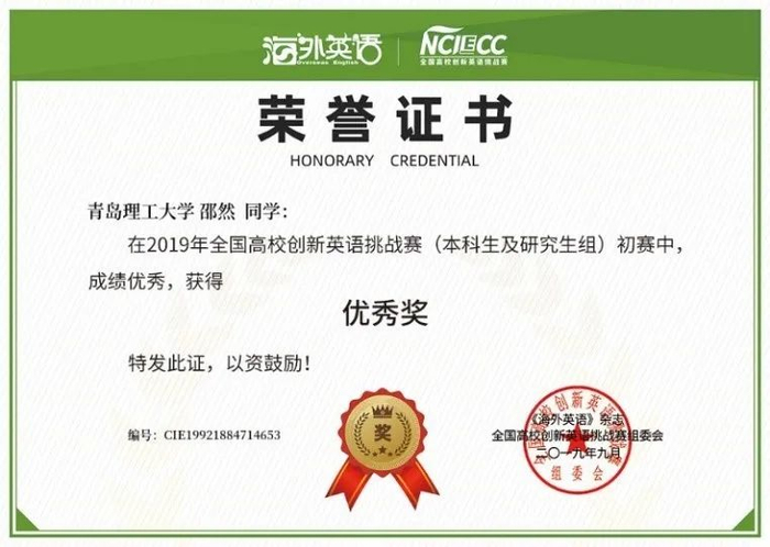 2019年9月NCIECC全国高校创新英语挑战赛优秀奖