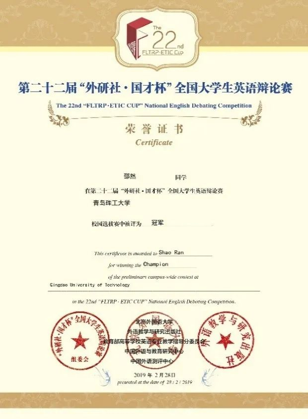 第二十二届“外研社∙国才杯”全国大学生英语辩论赛校级冠军及最佳辩手称号