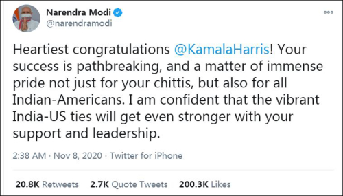 莫迪特别发文,称赞了这位来自印度的“副总统”,表示她的成功是开拓性的。莫迪坚信在哈里斯的领导和支持下,美国和印度的关系将更加牢固。