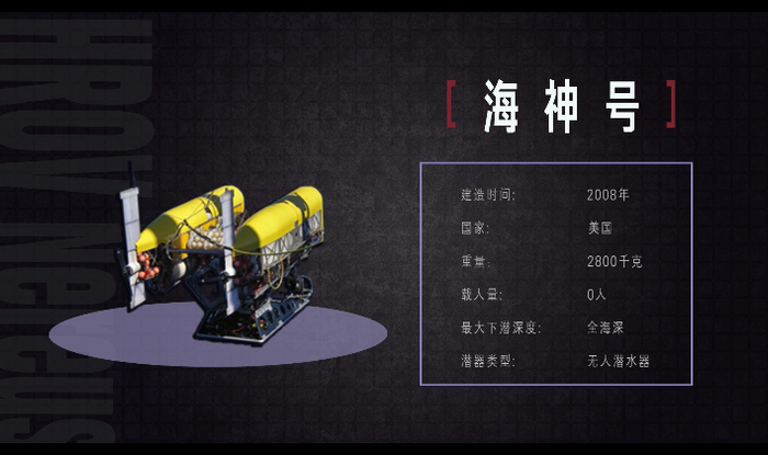 “海神”号,全海深无人潜水器,有远程遥控和自动作业两种模式,可以在深海极端环境下工作。