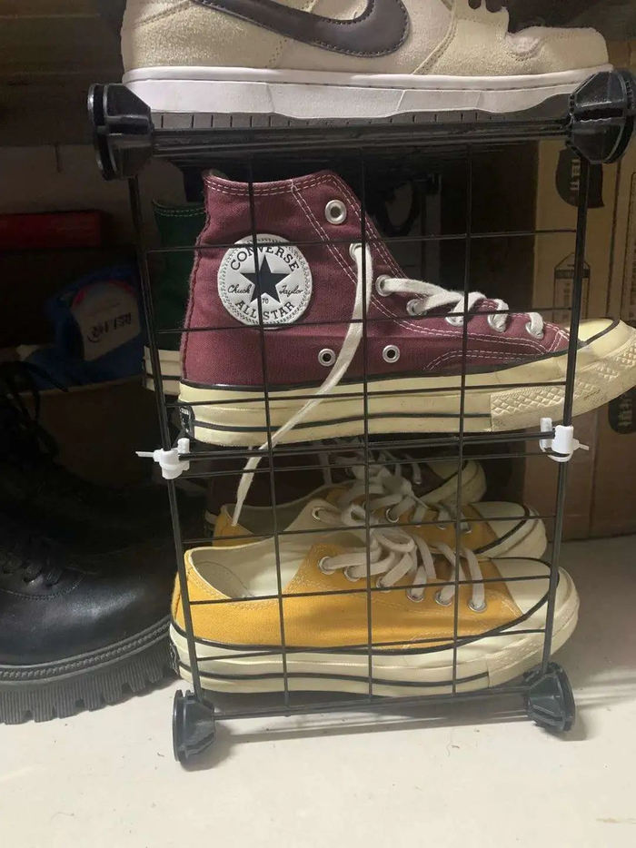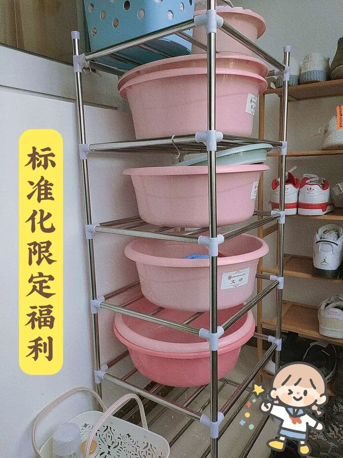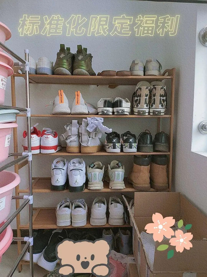 我们宿舍下铺床底下都有鞋架。强烈安利!!!因为真的很省空间!可以把拖鞋或者洗衣液什么放上去,井井有条!也让宿舍更加整洁干净,更容易打扫卫生!把鞋架拿出来拼装也是宿舍一起行动,加强了我们的团结和默契。