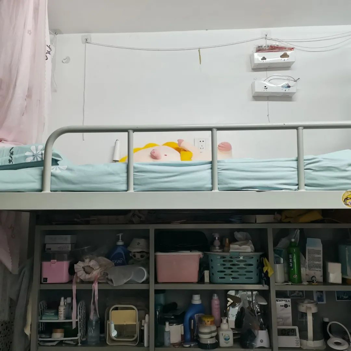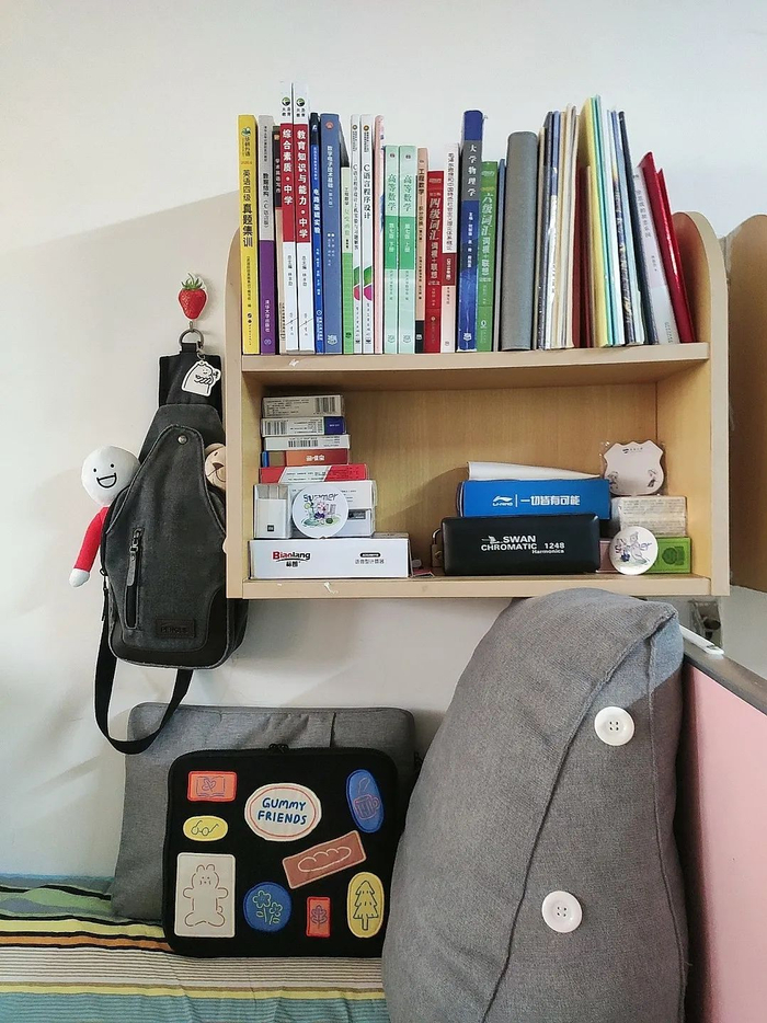 初到新宿舍虽然有点失落,但失落之后更多的还是满足,风趣温暖的新舍友,老舍友也没有因为分流而相距太远。当我把所有行李收拾好,看着自己的杰作,满满的幸福感:充实的大学生活终于又开始了!作为上铺死忠粉,床上折叠桌一定不能没有,当然还有三角大靠背,有了它不论在床上坐多久都不会累!(当然还是建议各位同学多出去走走)