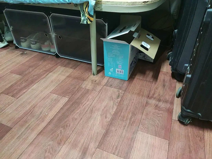 最最最想要推荐的当然还是八个人齐心协力铺了三个小时的浅红色地板贴。它,就是把水泥地变成木地板的秘密武器;它,也是让隔壁同学馋哭了的面包糠;它,还是让宿舍充满家的味道的最后一块拼图。