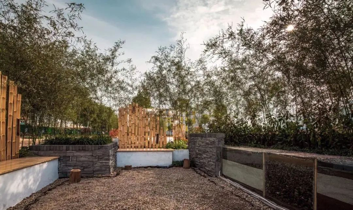 “筑•里”展示区场地采用围合方式并做下沉处理,利用入口处景墙形成东西展示空间。西侧展示空间采取工序展示方式,分别展示台阶和文化石饰面挡墙的工程、工艺做法;东侧展示空间采取剖切展示方式,分别展示挡墙砖基础和铺装施工做法。