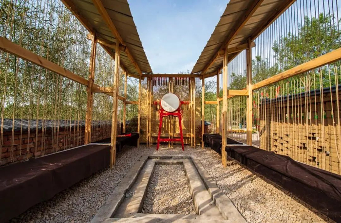以门口的贴合季相景观的落叶树为起点,游览者将心愿用毛笔写于竹签上挂在门前树上,走进“乡土”尽情敲击鼓面,寓意着在家乡的土地上用奋斗和自己勤劳的双手实现美好愿景。鼓代表着西北人浑厚坚定的性格特点,象征的民族的“声声”不息。