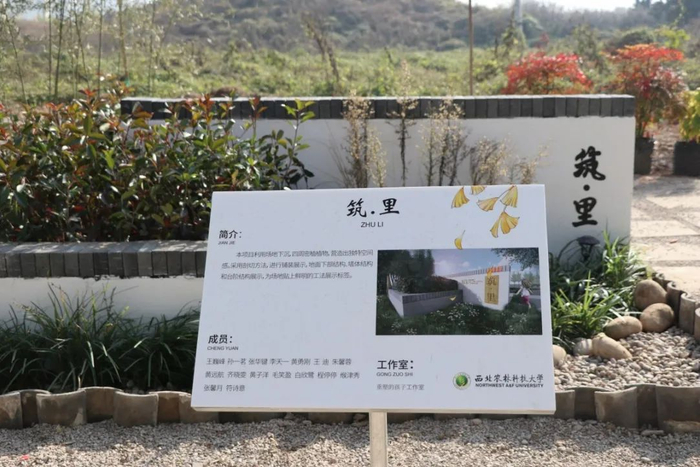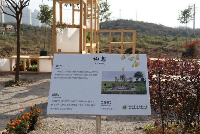 “构想”的场地构筑物从园林学院的院徽衍生而来,整个构架分成了地面上的一个框型和立在上方的梁架:上方的构架承载着多样的园林蕴意,下方的框型从园林学院的外框保留;构架表示基础,是园林学院的老师学生共同构筑,寓意园林梦、西农梦由大家一起构想。