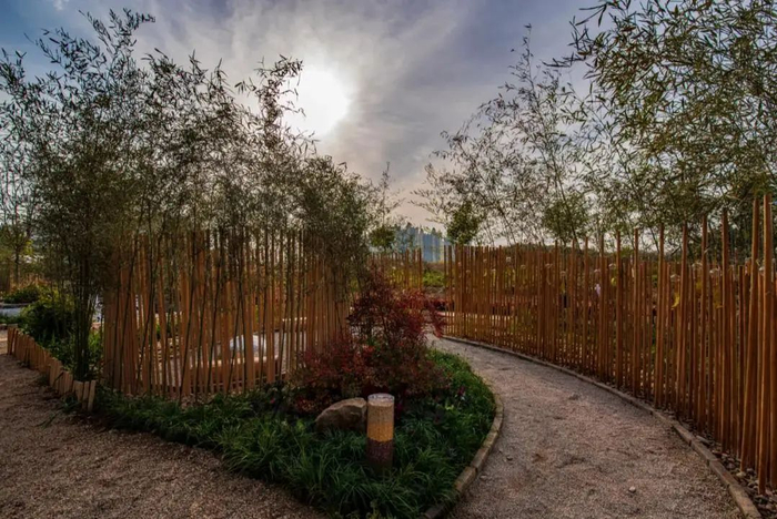 场地中心的不锈钢半球则是空间的焦点所在,球面镜投射出周围的一切,将天地万物微缩于一隅。当参观者走入场地的闭合空间,无他,唯有天地、竹影与自己,此身虽在小世界中,但心绪早已处于广袤无垠的自然之中。