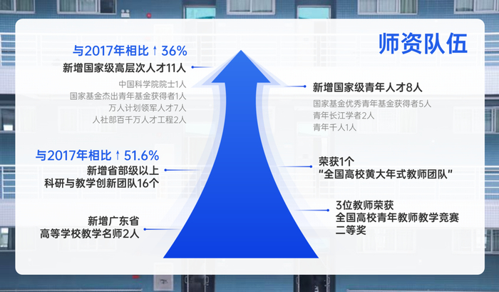 在师资队伍建设方面:新增院士、杰青、万人计划等国家级高层次人才11人,比2017年增长了36%,新增国家级青年人才8人。新增省部级以上科研与教学创新团队16个,比2017年增长了51.6%。新增广东省高等学校教学名师2人,荣获“全国高校黄大年式教师团队”1个,3位教师荣获全国高校青年教师教学竞赛二等奖。