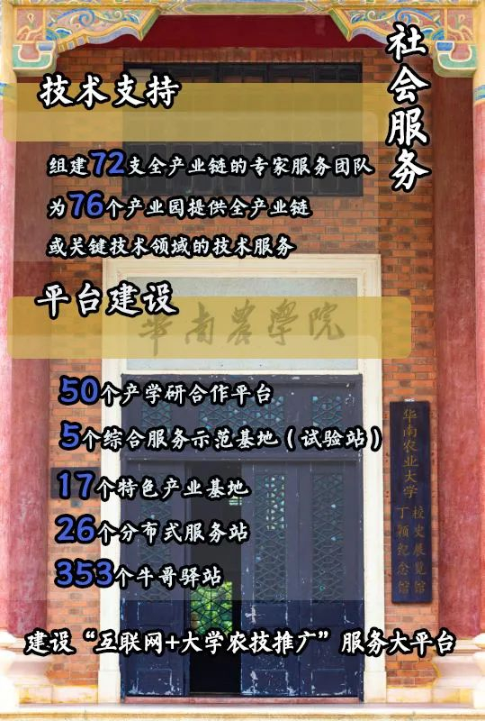 在社会服务方面:建设50个产学研合作平台、5个综合服务示范基地(试验站)、17个特色产业基地、26个分布式服务站和353个牛哥驿站。组建72支全产业链的专家服务团队,为76个产业园提供全产业链或关键技术领域的技术服务。建设“互联网+大学农技推广”服务大平台。