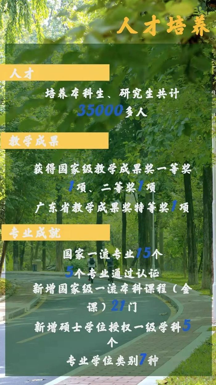 在人才培养方面:三年来培养本科生、研究生共计35000多人;获得国家级教学成果奖一等奖1项、二等奖1项、广东省教学成果奖特等奖1项;新增国家一流专业15个,5个专业通过工程教育专业认证;新增国家级一流本科课程(金课)21门;新增硕士学位授权一级学科5个,专业学位类别7种。