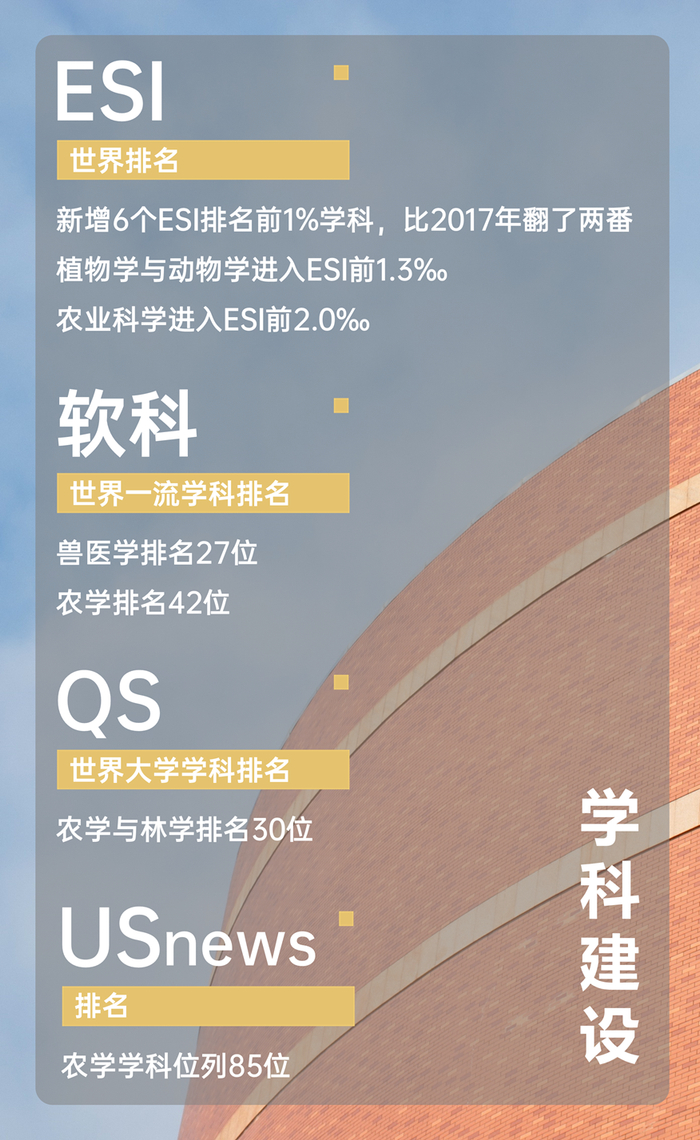 在学科建设方面:新增6个ESI排名前1%学科,比2017年翻了两番。植物学与动物学进入ESI前1.3‰,农业科学进入ESI前2.0‰。新增世界前50学科3个,其中农学与林学QS世界大学学科排名30,软科世界一流学科排名中兽医学排名27位、农学排名42位。