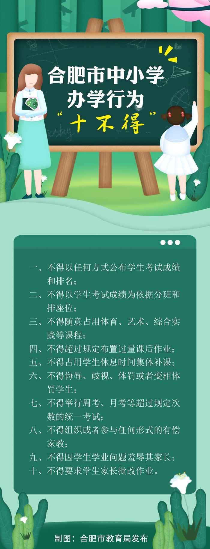 合肥市教育局出台《合肥市中小学办学行为“十不得”》,其中第十条规定不得要求家长批改学生作业 合肥市教育局微信公众账号 图