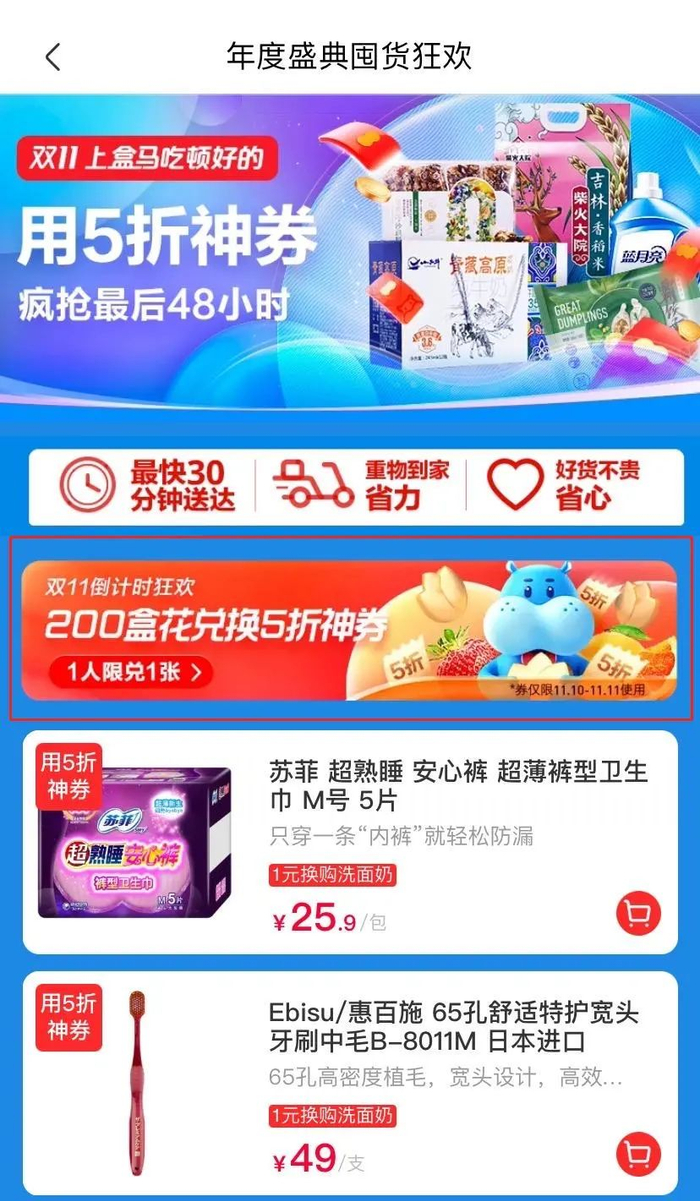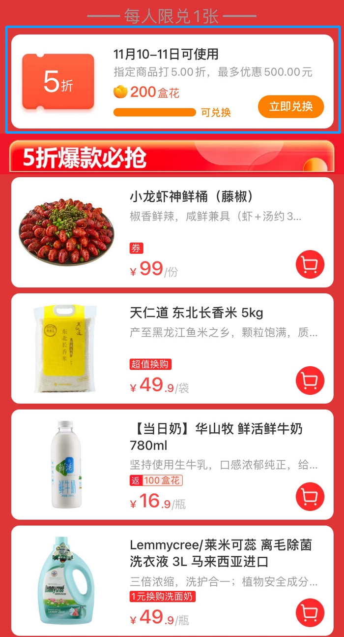 领取方式:打开盒马APP,点击顶部“用5折神券”图片即可进入活动页面,点击200盒花兑换,即可领取5折券。