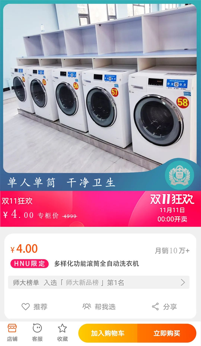 东西区洗衣房的存在,让我们也成为了“别人的学校”。全自动化程序,无需排队。全批量生产,安全洁净。不仅有单人单桶的个性化选择,还有超柔洗,快洗等多种功能。机械转筒堪比“妈妈的手”,为师大学子送去温暖。