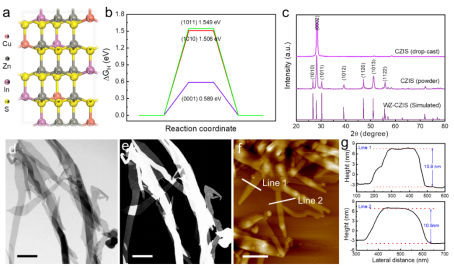 图1. DFT计算和CZIS纳米带的结构和形貌表征。(a)晶体结构示意图。(b)(0001)、(1010)和(1011)晶面的光催化析氢反应吉布斯自由能。(c)XRD图。(d-e)TEM图。(f-g)AFM图和相应的高度统计图。