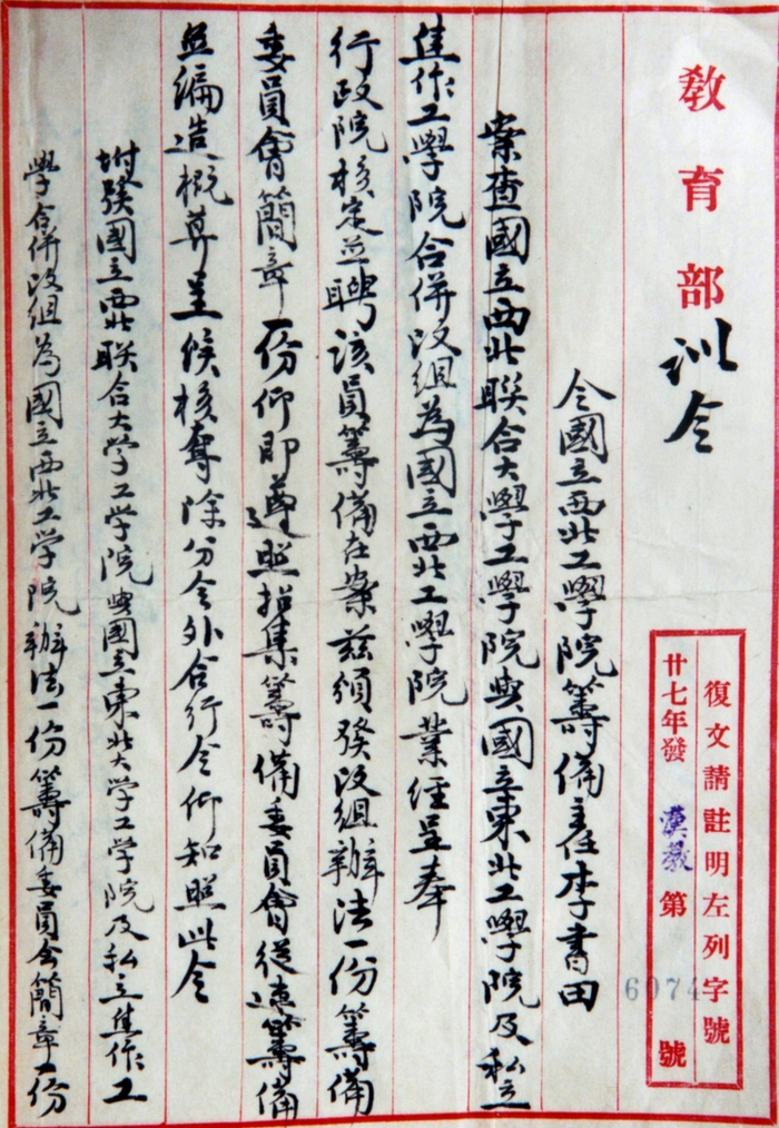 1938年7月27日,南京国民政府教育部长陈立夫签发6074号训令,令北洋工学院、北平大学工学院、东北大学工学院和私立焦作工学院合组为国立西北工学院。训令同时附《国立西北联合大学工学院与国立东北大学工学院及私立焦作工学院合并改组为国立西北工学院办法》。