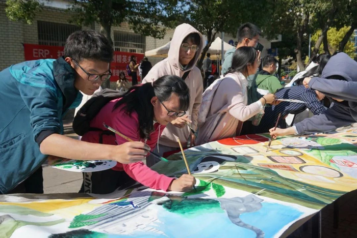 四川的熊猫、武汉的黄鹤楼、贵州的茅台酒……来自全国各地的师生共70余人共同在20米的长卷上挥洒笔墨,将大好山河一点点在长卷上铺展,用诗词笔墨共绘“大美中国”。工业设计专业教师王浩滢寄语我校师生,在卷尾写下“国泰民安神州地,英才卓硕南农人”。