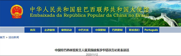 12日,中国驻巴西使馆发言人则就美国政客涉华错误言论发表谈话表示,美国副国务卿克拉奇在访问巴西期间,恶意攻击中国5G技术安全,散布针对中国和中国企业的政治谎言。其言论罔顾事实,其真实意图是污蔑抹黑中国,离间中巴正常合作。我们对此表示坚决反对。