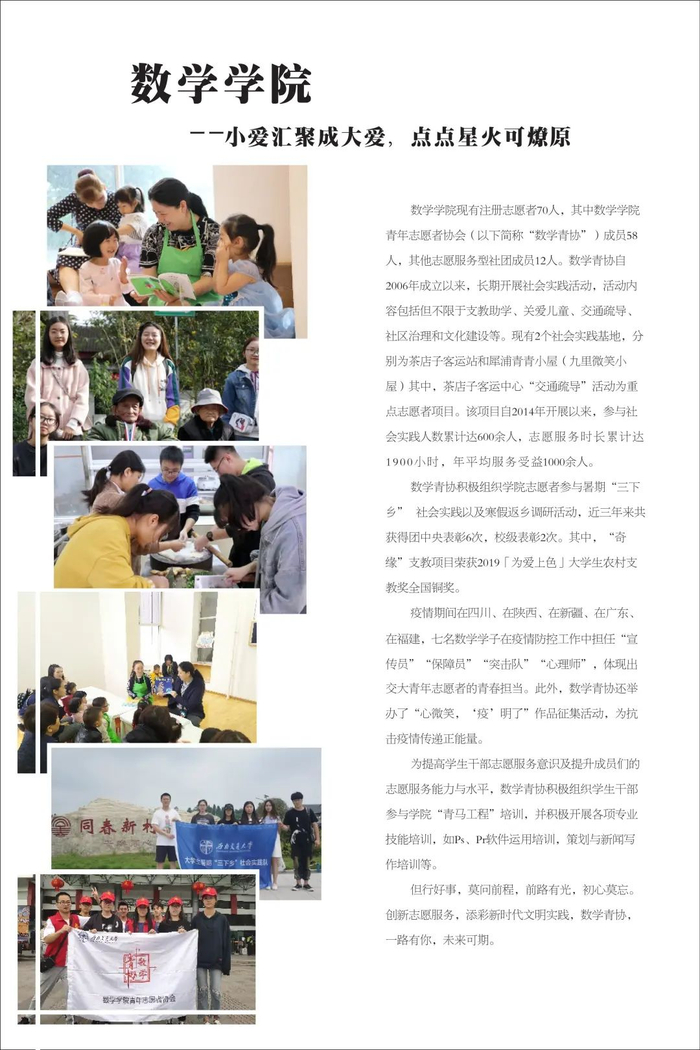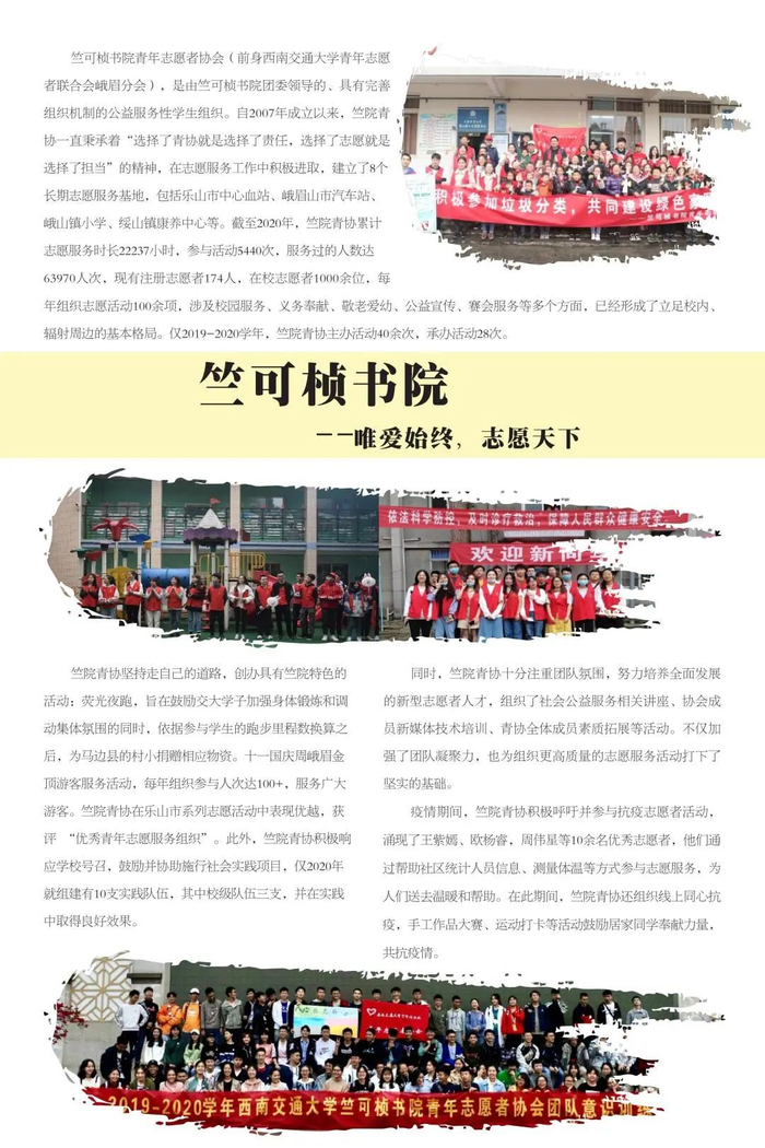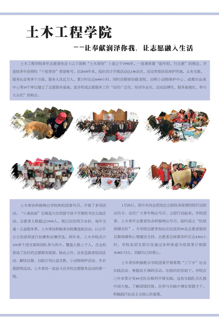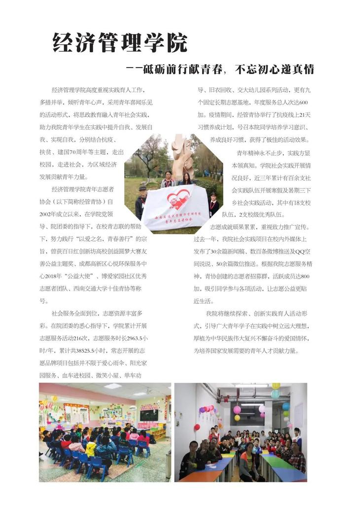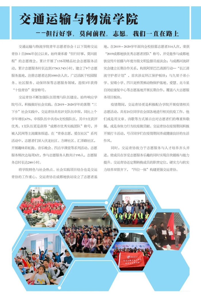 不忘初心传达爱,志愿服务新时代。学校共青团不忘初心、牢记使命,始终围绕立德树人根本任务,强化实践育人,广泛开展校地合作、项目共建,在全国各地及行业企业建立了100余个志愿服务社会实践基地,学校注册志愿者人数超过3万人,志愿服务时间每年平均超过50万小时,形成了具有西南交通大学特色的志愿服务名片。2019年西南交通大学当选成为四川省志愿服务联合会首届理事单位。学校各级团组织将加强统筹组织,引导广大学生积极参与社会实践与志愿服务活动,让青年在服务人民、奉献社会中不断成长和进步,为培养德智体美劳全面发展的社会主义建设者和接班人贡献青春力量。