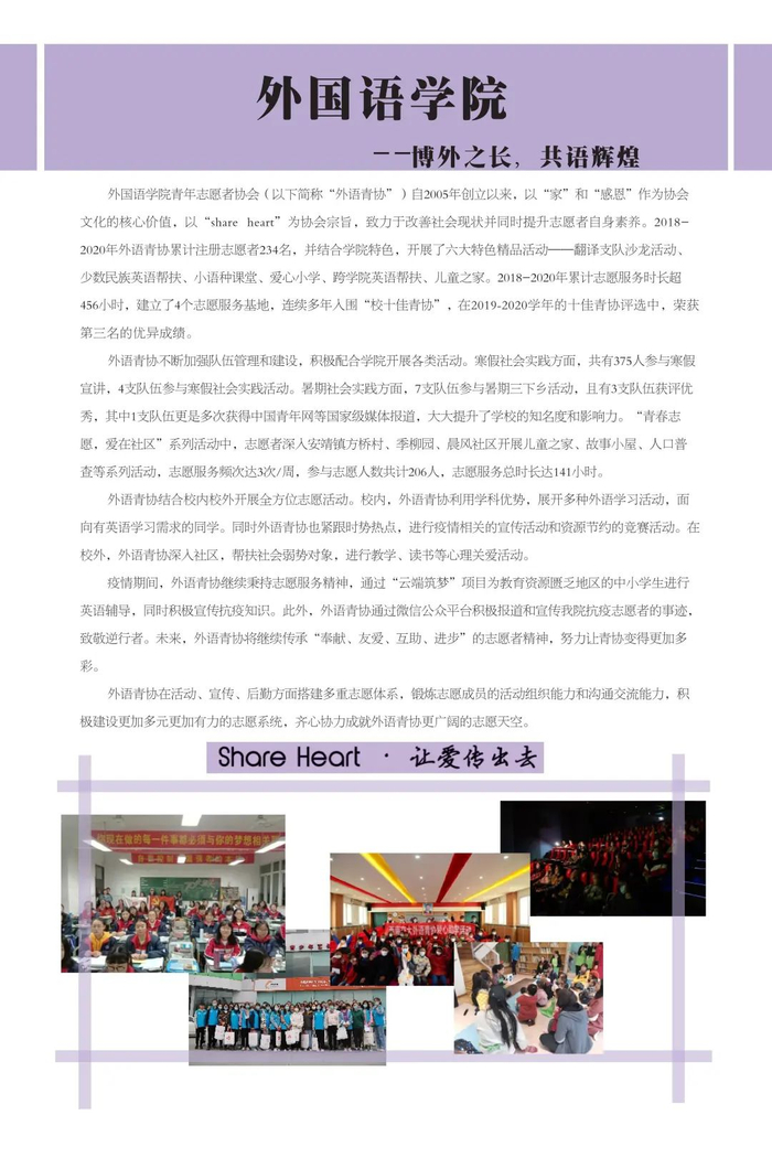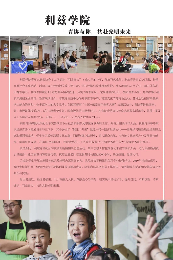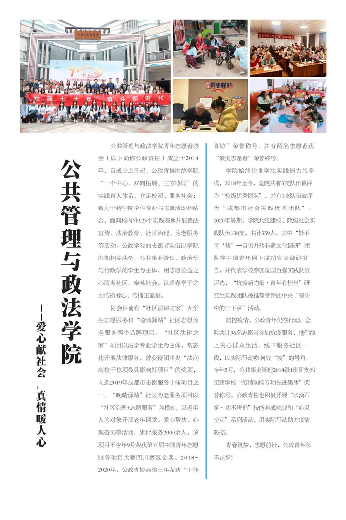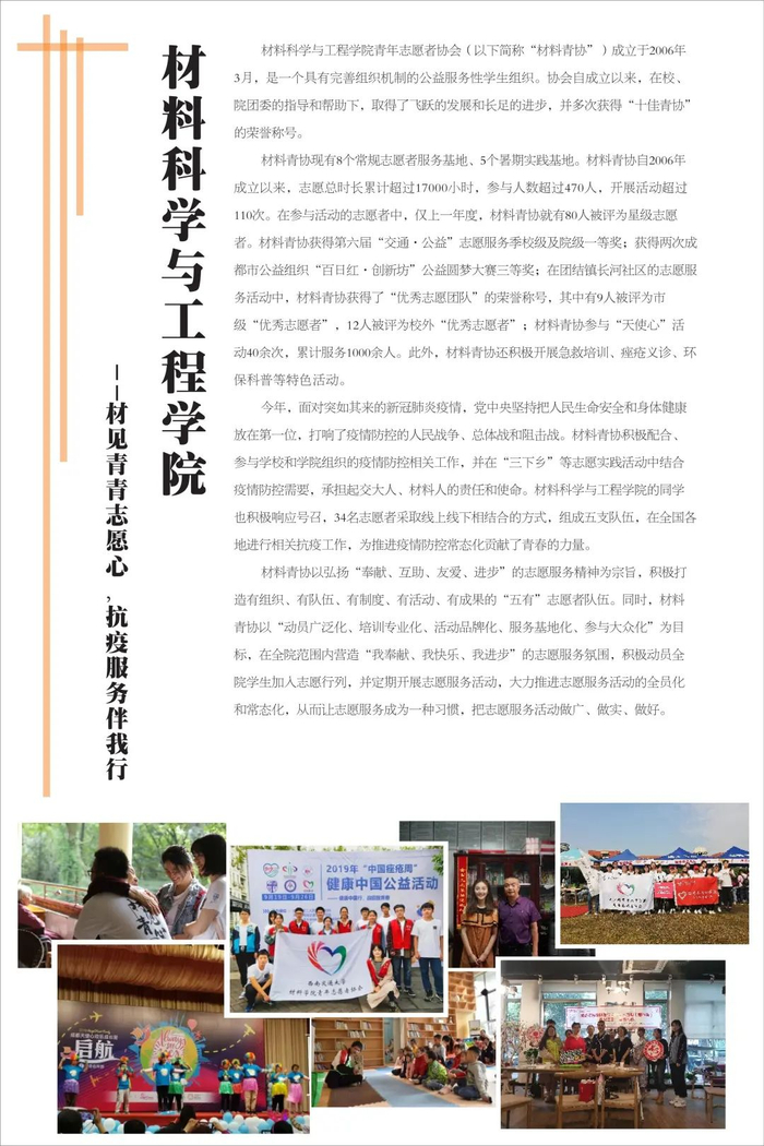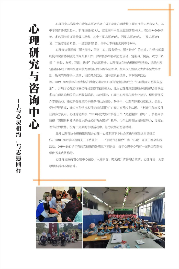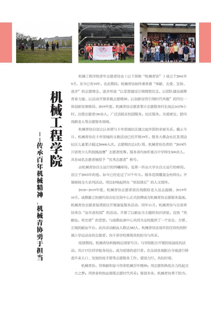 不忘初心传达爱,志愿服务新时代。学校共青团不忘初心、牢记使命,始终围绕立德树人根本任务,强化实践育人,广泛开展校地合作、项目共建,在全国各地及行业企业建立了100余个志愿服务社会实践基地,学校注册志愿者人数超过3万人,志愿服务时间每年平均超过50万小时,形成了具有西南交通大学特色的志愿服务名片。2019年西南交通大学当选成为四川省志愿服务联合会首届理事单位。学校各级团组织将加强统筹组织,引导广大学生积极参与社会实践与志愿服务活动,让青年在服务人民、奉献社会中不断成长和进步,为培养德智体美劳全面发展的社会主义建设者和接班人贡献青春力量。